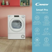 Сушильная машина Candy CSOE C10DG-07 в корпусе белого цвета поддерживает программу легкого глаженья и антисминания, которая не допускает появления складок на одежде.