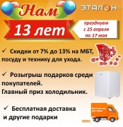 А это и специальные суперцены, на товары с ценником "Эталон. Нам 13!", бесплатная доставка до подъезда, подарки при покупке.